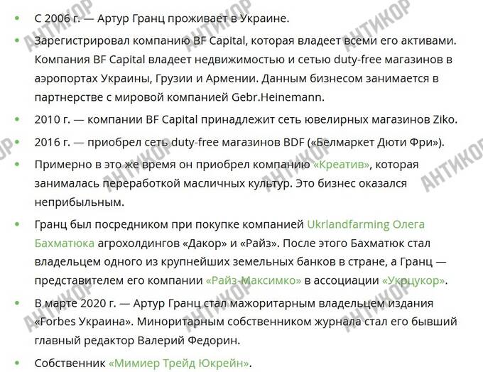 Більш-менш така ж картина і в інших компаній, деякі з яких перебувають у стадії ліквідації. У зв’язку з цим привертає до себе увагу матеріал про Артура Гранца на сайті Латифундист, де дається розшифровка того, чим саме займаються і фірми Гранца, і він сам. Проте у податкових органів України питань до Артура Гранца не виникає.