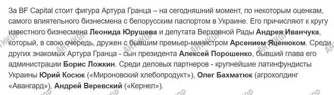 Реакції на це не було жодної. Окрім того, на білоруське громадянство, яке тоді ще мав (і, можливо, має й досі) Артур Гранц, теж заплющили очі, хоча нардеп Мазурашу прямо звертався до секретаря РНБО із цього приводу. Але в списках санкцій, які щедро роздає ОПУ, прізвища білорусько-вірменського підданого Артура Гургеновича Гранца так і не виявилося. Ні за приналежність до ворожої країни, ні за контрабанду, хоч і за те, і за інше в ці списки інколи вносилися зовсім сторонні люди. На цьому фоні привертає увагу інформація про зв’язки Гранца – окрім вже згаданого Іванчука, серед партнерів Артура Гранца були люди з найближчого оточення п’ятого президента України.